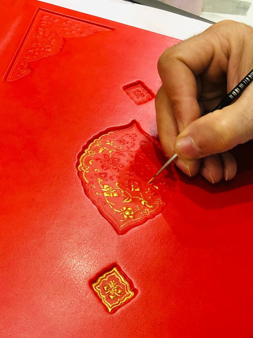 جانب من اعمال شعبة الفنون الاسلامية في مركزنا مركز الامام الحسين عليه السلام للمخطوطات والتحقيق وهو تذهيب الاغلفة الخاصة بالمخطوطات.