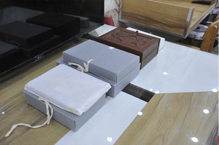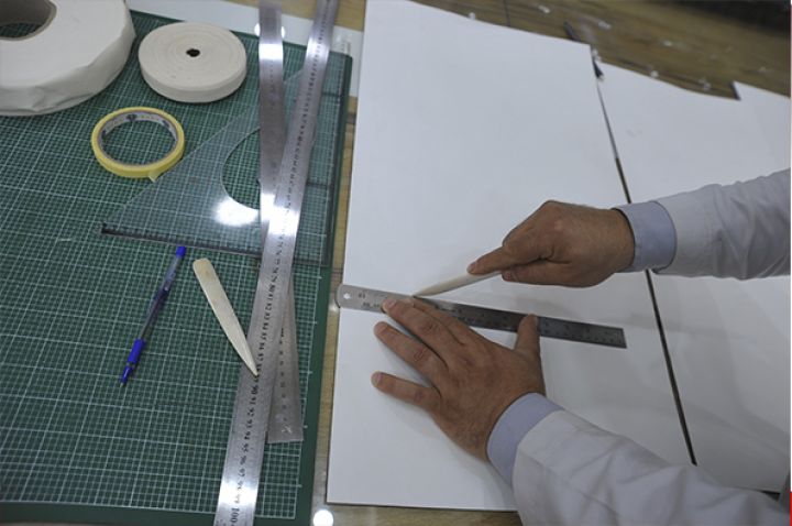 عمليات صناعة العلب الخاصة بالمخطوطات وفق المواصفات الخاصة للورق وهو عبارة عن ورق (مقوى) قاعدي خلي من مادة( اللكنين ) حيث لايؤثر على الغلاف الخارجي للمخطوط ان وجد او اوراق المخطوط الفاقد لغلافها.